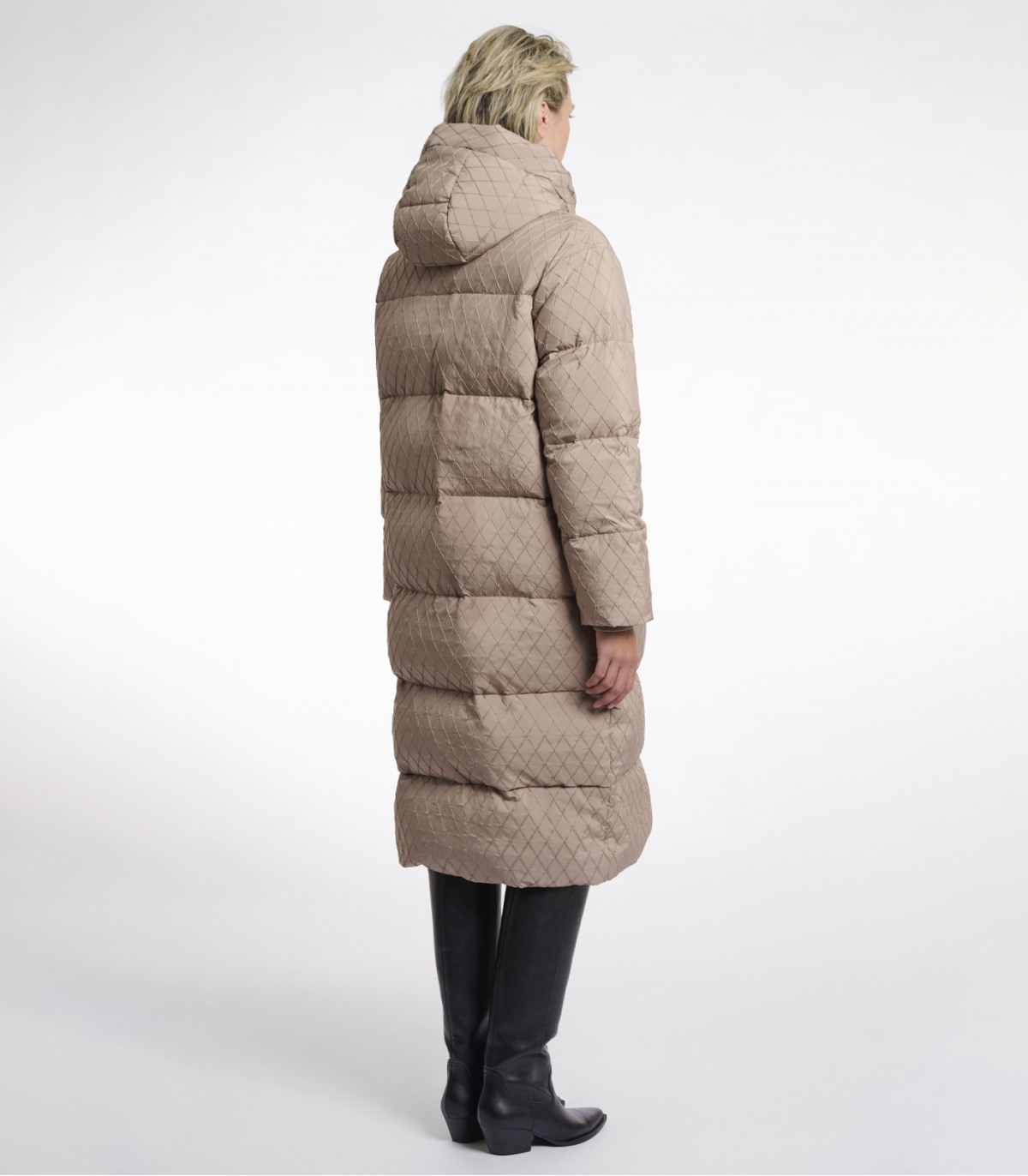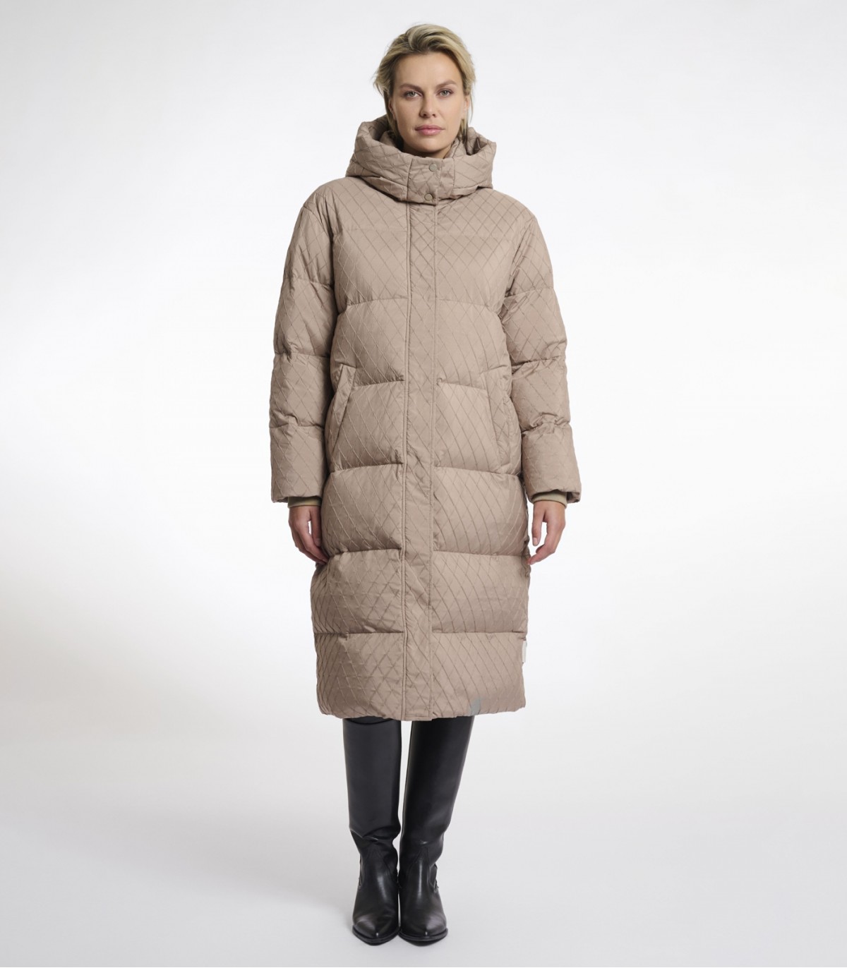 Šis garais stepētais mētelis nodrošinās siltumu un komfortu aukstās dienās. Tam ir augsta apkakle un kapuce ar spiedpogām un aukliņas aizdari. Tas aiztaisāms ar rāvējslēdzēju un spiedpogām priekšpusē, un tam ir praktiskas sānu kabatas. Mētelim ir unikāls un mūžīgs rombveida raksts.