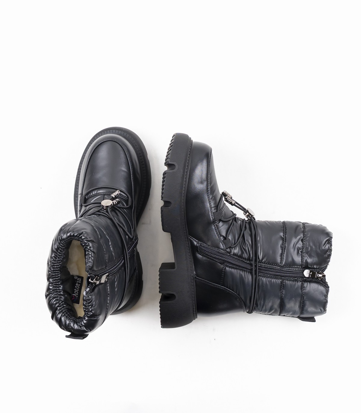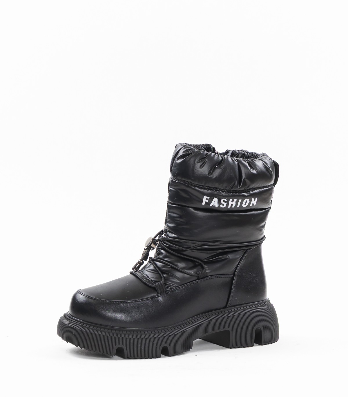Silti un izturīgi melni ziemas zābaki meitenēm, kas lieliski piemēroti aukstām, sniegotām dienām. Mīksta kažokādas odere uztur pēdas siltas, savukārt sānu rāvējslēdzējs un regulējamas auklas atvieglo uzvilkšanu. Biezais protektors uz zoles nodrošina lielisku saķeri uz slidenām virsmām.